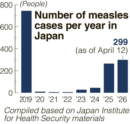 Although 744 measles cases were reported across the nation in 2019, there were 10 or fewer recorded in each of the three following years. However, cases began increasing in 2023 and climbed to 265 in 2025. This year, the number of cases has already reached 299 as of April 12. A cluster of infections was detected at an elementary school in the Tokyo metropolitan area this month.