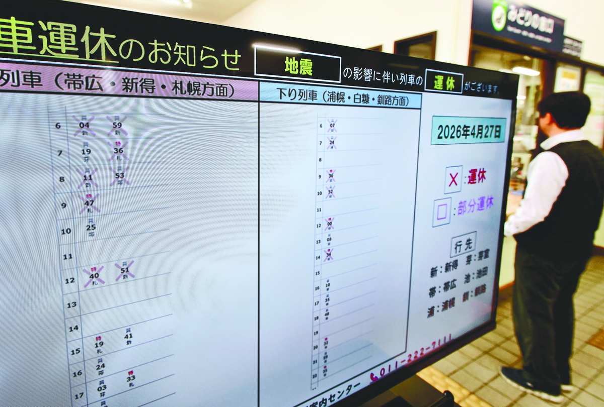 A man looks at a signboard notifying train passengers information on service cancellations due to an earthquake at JR Ikeda Station in Ikeda, Hokkaido, on Monday morning.