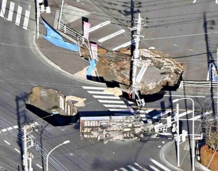 Another Collapse in Saitama Pref. Road Connects Two Existing Sinkholes; Cause Apparently Was Sewer Pipe Corroded by Hydrogen Sulfide