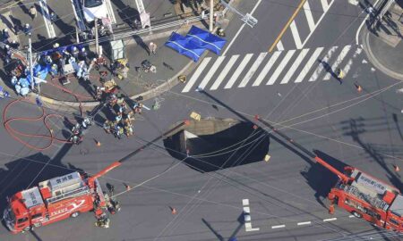 Truck Falls into 10-Meter-Deep Sinkhole at Intersection in Saitama Pref.’s Yashio; Rescue Operations Underway
