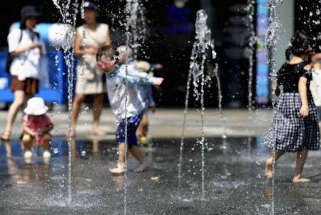 Children Play in Water at Solamachi Square, Tokyo, as Temperatures Exceed 35 C for 9th Straight Day, Tying Records