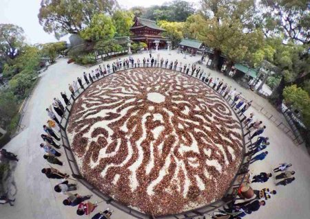 Leaf-Raking Event at Dazaifu Tenmangu Shrine Commemorates Legendary Camphor Tree; ‘Sen-nen Kusu’ Died in 1994 but Lives on in Annual Art Project