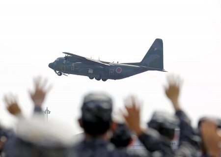 An Air Self-Defense Force C-130 transport plane left Komaki Air Base in Aichi Prefecture to deliv...