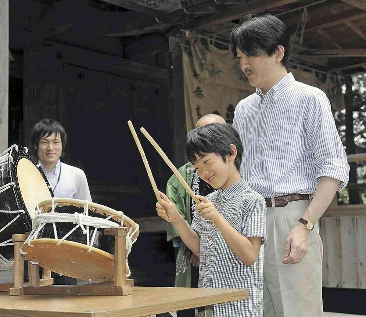 Prince Hisahito tries his hand at drumming in Yuza, Yamagata Prefecture, in July 2015.