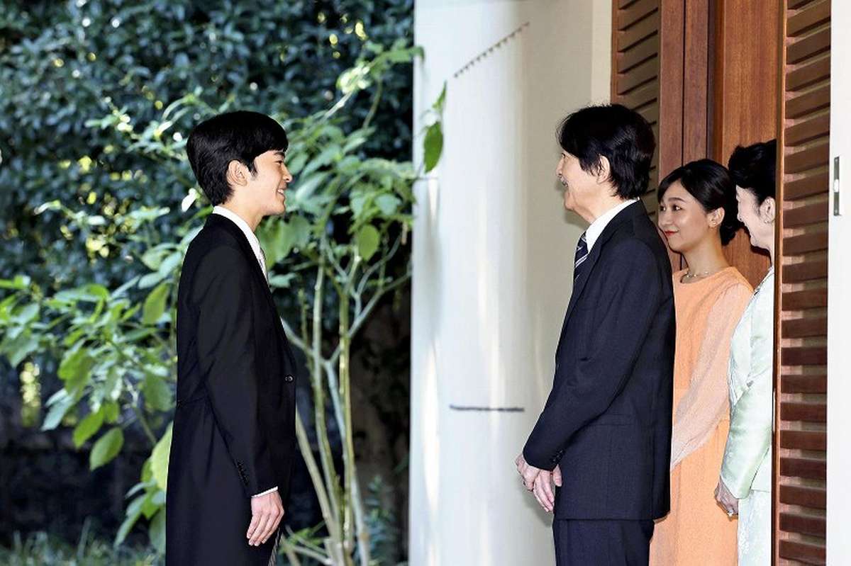 The prince is seen off by Crown Prince Akishino, Crown Princess Kiko and Princess Kako at their residence as he leaves for the coming-of-age ceremony on Saturday. -