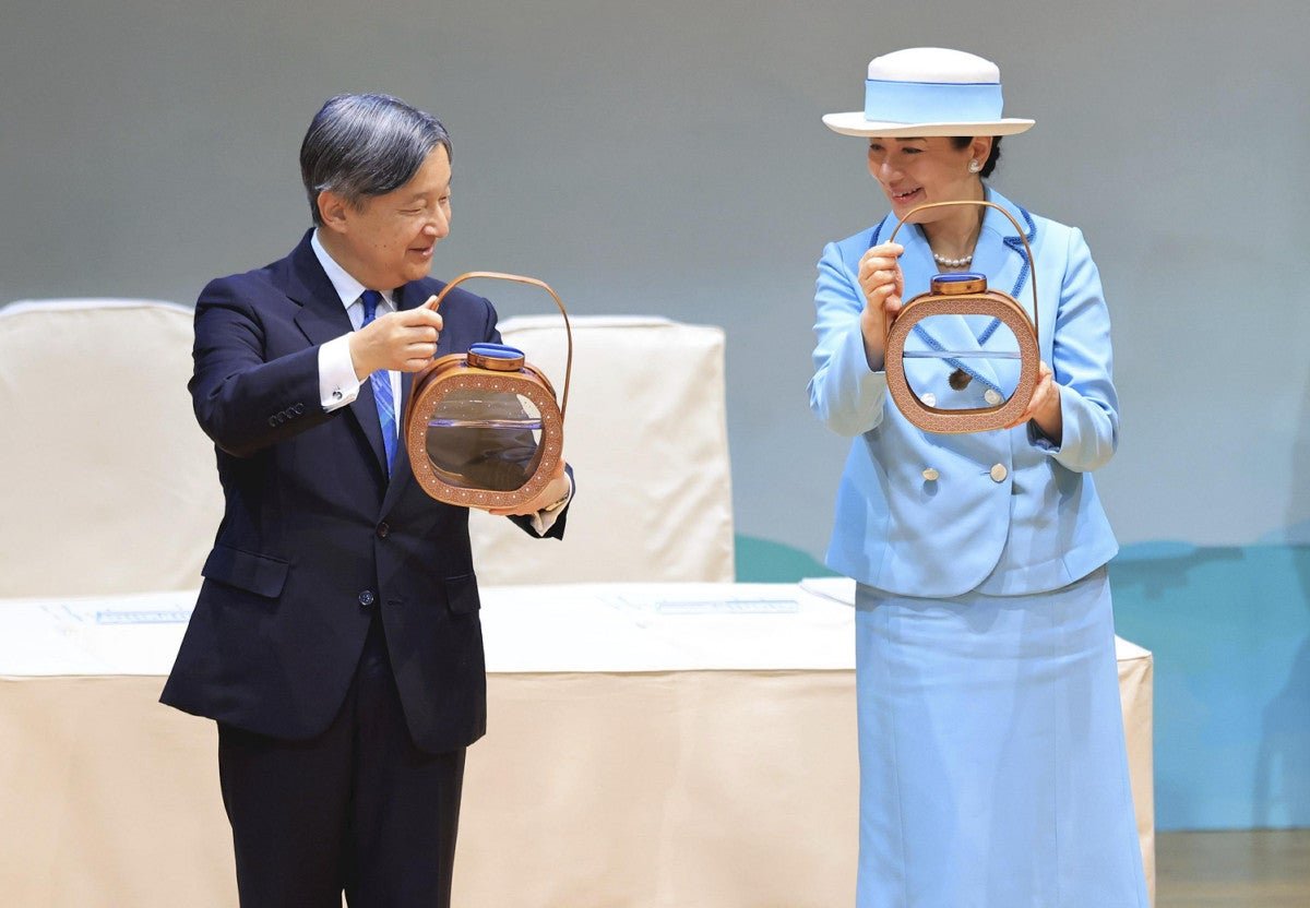 The Emperor and Empress hold containers of young fish at the 44th annual national Festival of Celebration for Maritime Resources in Shima, Mie Prefecture, on Sunday.