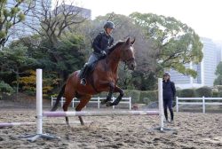 In the morning on Dec. 19, a guard of the Imperial Guard Headquarters was doing drills at an area for practicing dressage on the grounds of the Imperial Palace, which is close to the Otemachi business district in Chiyoda Ward, Tokyo. The guard rode the horse at a steady pace, jumped over obstacles and practiced other techniques.