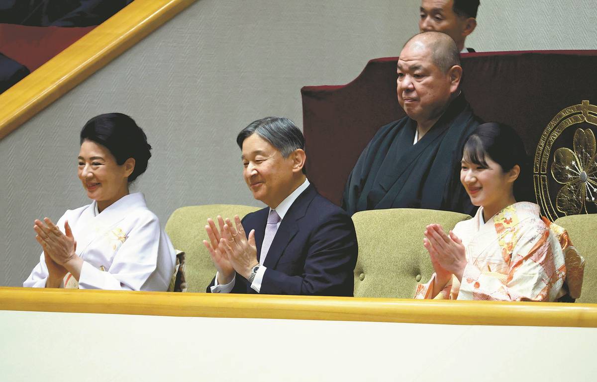 From left: The Empress, the Emperor and Princess Aiko applaud at Ryogoku Kokugikan stadium in Sumida Ward, Tokyo, on Sunday.