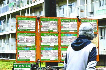 Multilingual notices are displayed where recycling is placed in Icho Danchi housing complex in Yamato, Kanagawa Prefecture.