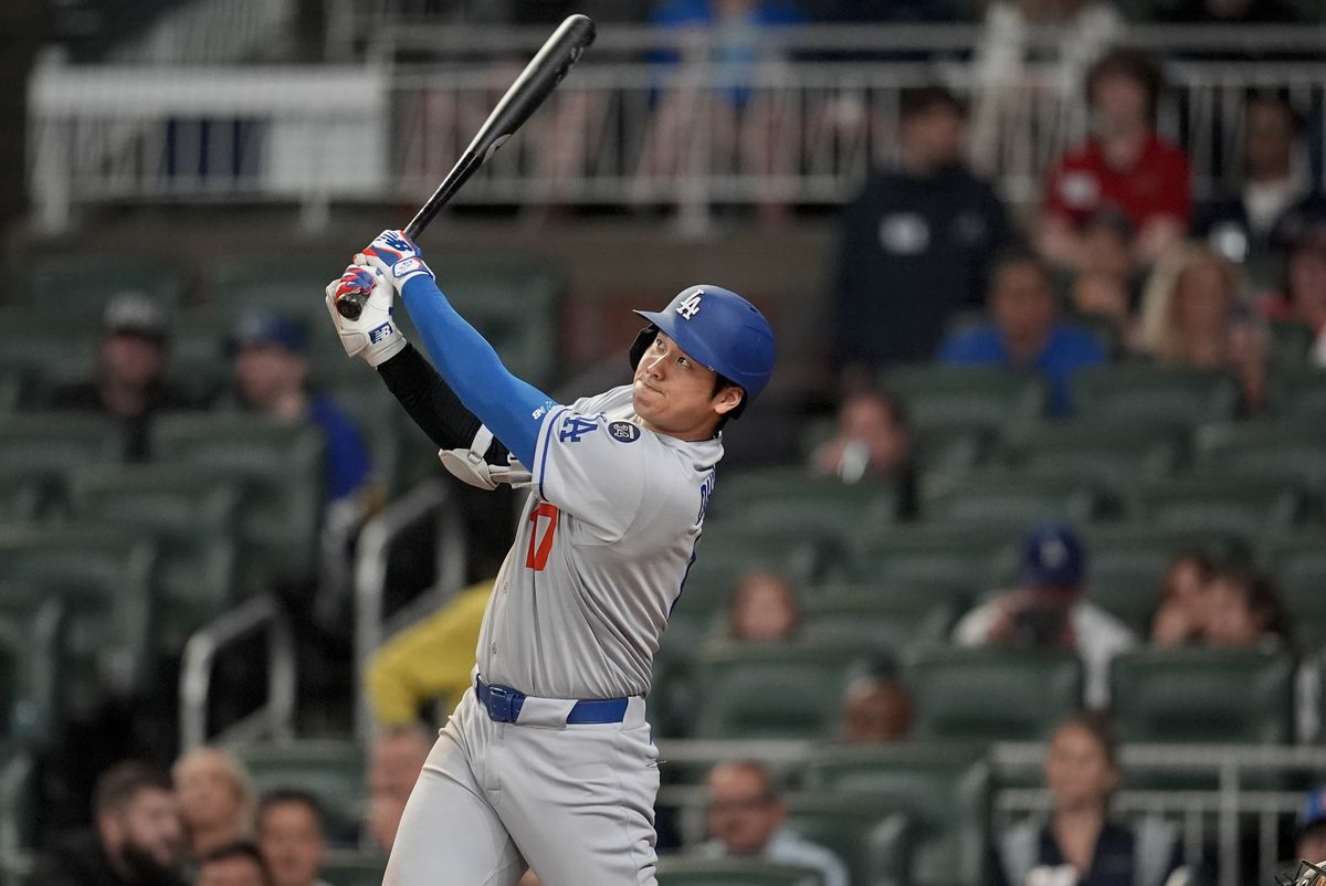 Los Angeles Dodgers two-way player Shohei Ohtani (17) hits a solo homer against the Atlanta Braves in the third inning of a baseball game on Saturday in Atlanta.