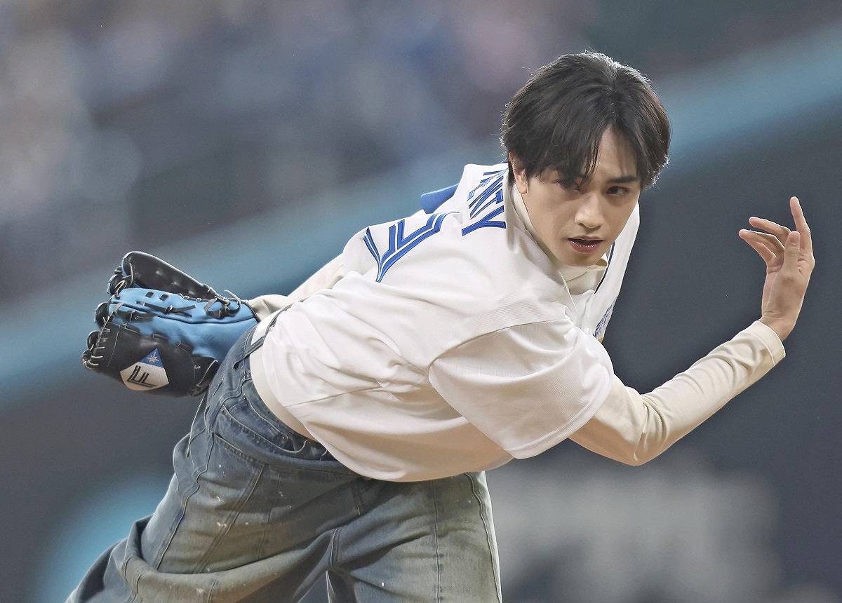 Artist and actor Kento Nakajima performed the first pitch ceremony at the Hokkaido Nippon-Ham Fighters vs. Orix Buffaloes game at Es Con Field Hokkaido in Kita-Hiroshima, Hokkaido, on Thursday.