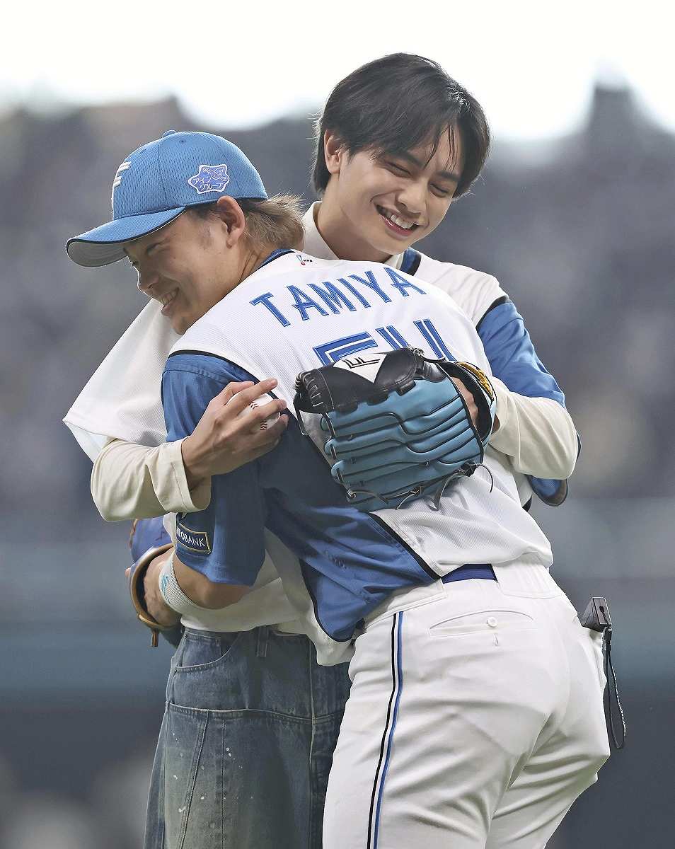 Nakajima wore a Fighters uniform with the number “13” and “N. Kenty” on the back. After taking a big swing at the pitch, it bounced and landed in the mitt of Fighters’ catcher Yua Tamiya, who is a big fan of Nakajima.