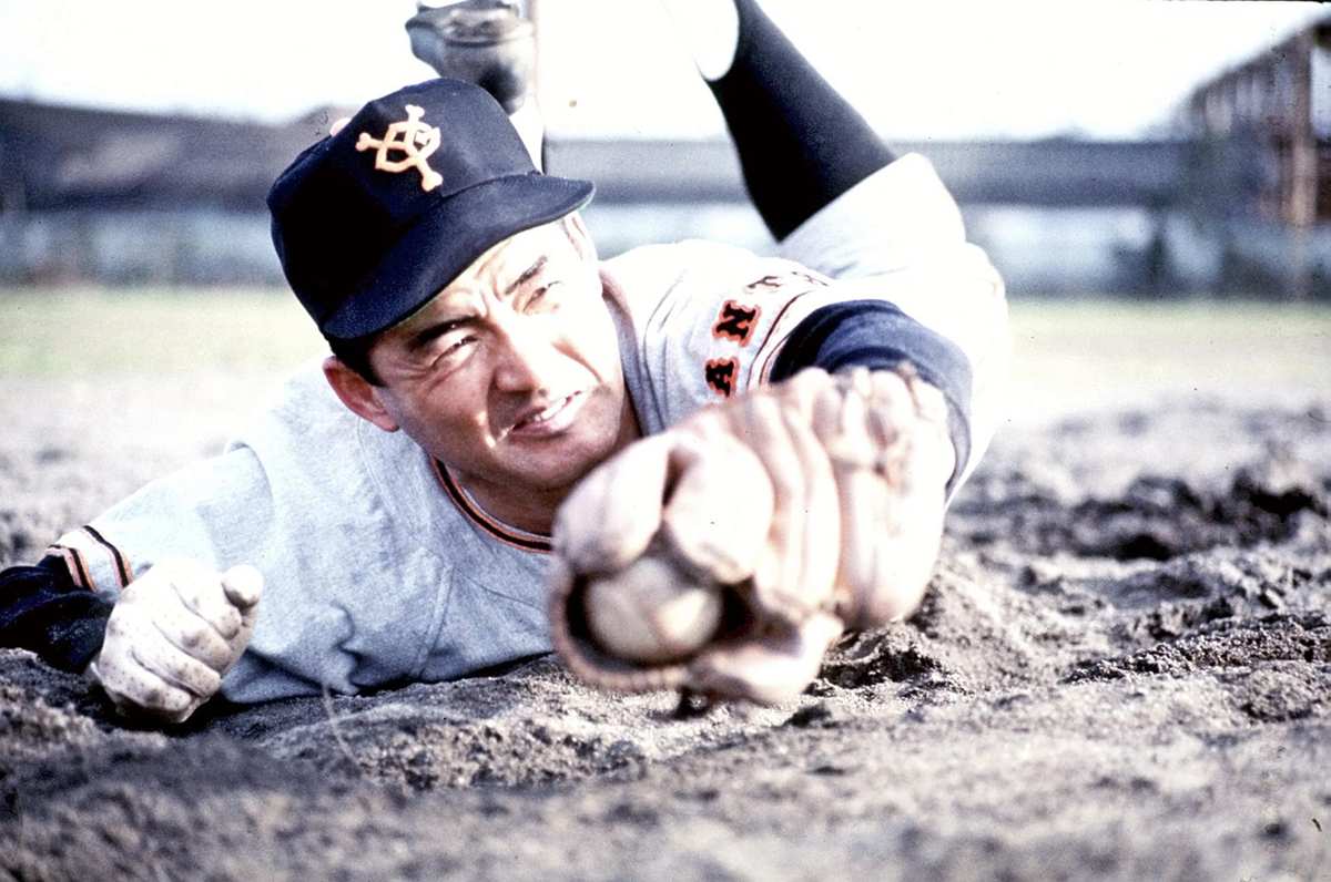 Shigeo Nagashima dives for the ball during a spring training camp in Miyazaki in 1969.