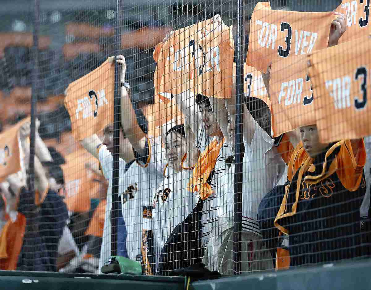A season-high 42,403 spectators packed Tokyo Dome on Saturday. At the end of the fifth inning, the audience used orange and black towels distributed beforehand to form letters that spelled out, “Mr. GIANTS” and “NAGASHIMA SHIGEO,” expressing their respect and gratitude for the legend.