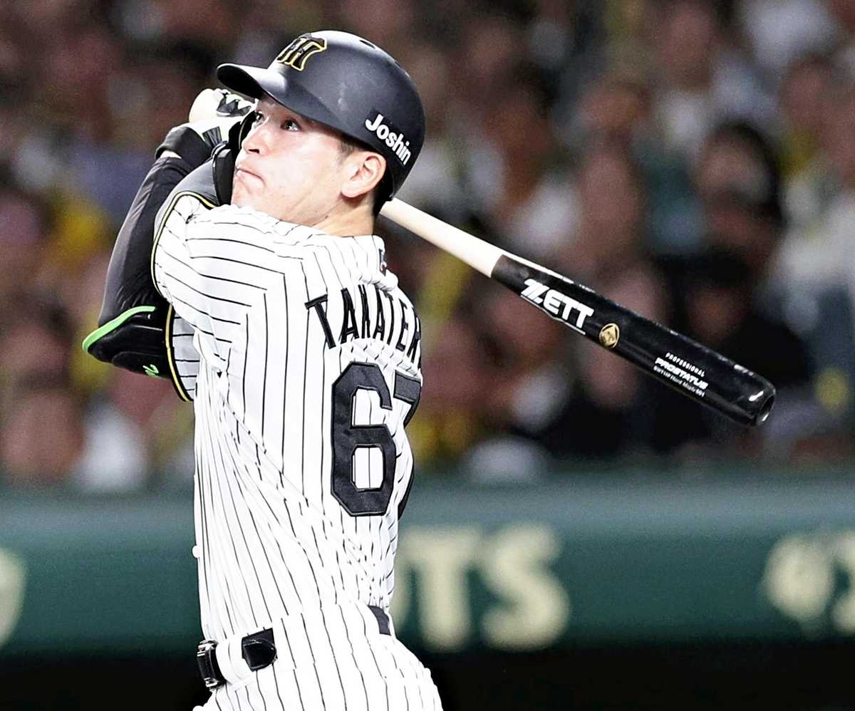 Hanshin’s Nozomu Takatera hits a sacrifice fly to bring in the third runner in the second inning at Koshien Stadium on Sunday. -