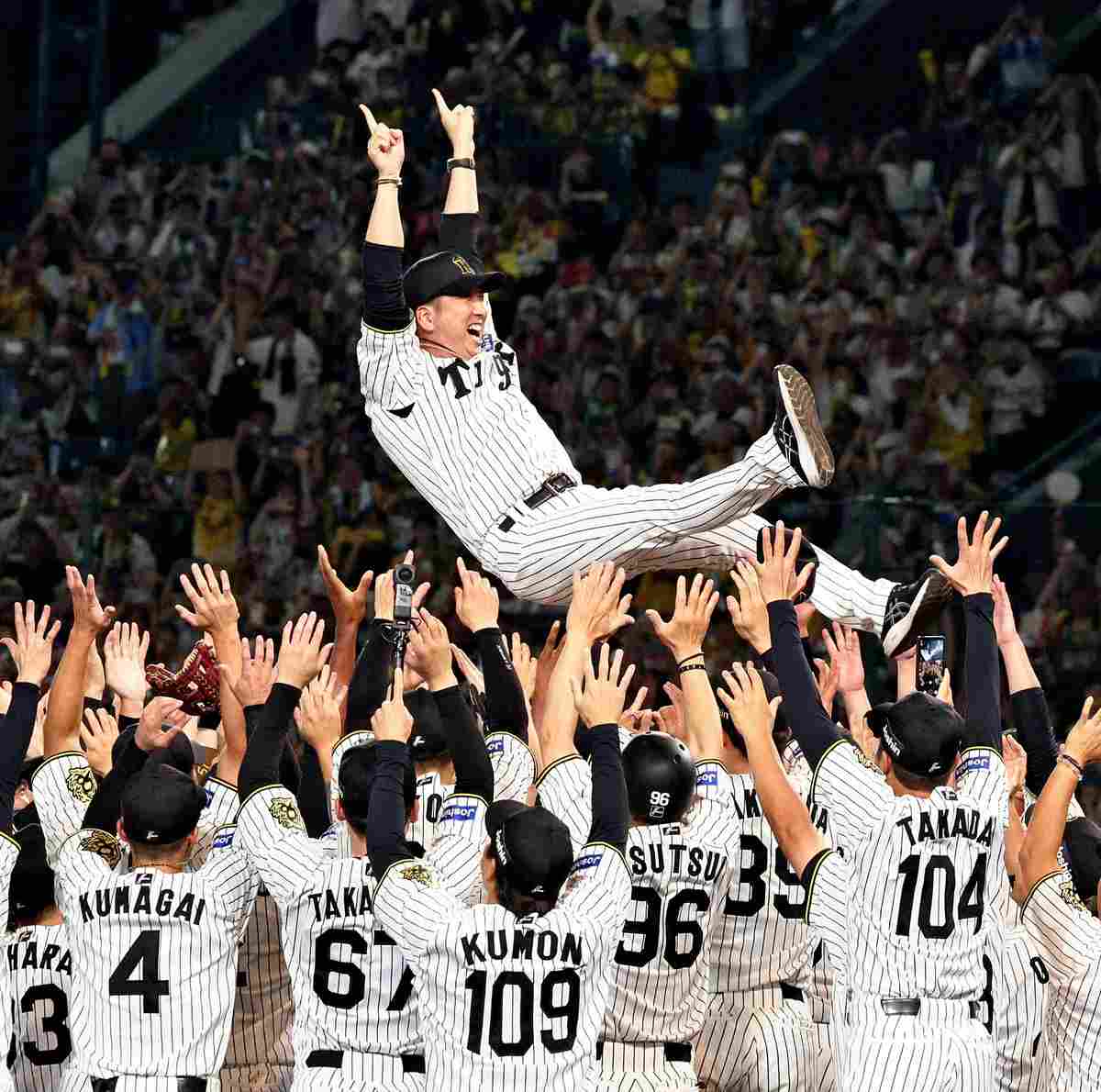 Hanshin Tigers manager Kyuji Fujikawa is tossed by players after his team won the Central League title by beating the Hiroshima Toyo Carp on Sunday.