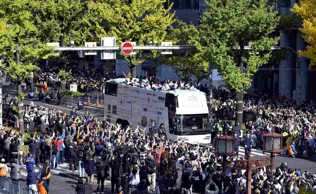 Manager Kyuji Fujikawa and Tigers players boarded three buses, which traveled a 1.7-kilometer stretch of Midosuji street for half an hour. The route was the same as when the Tigers won the Central League title in 2023.