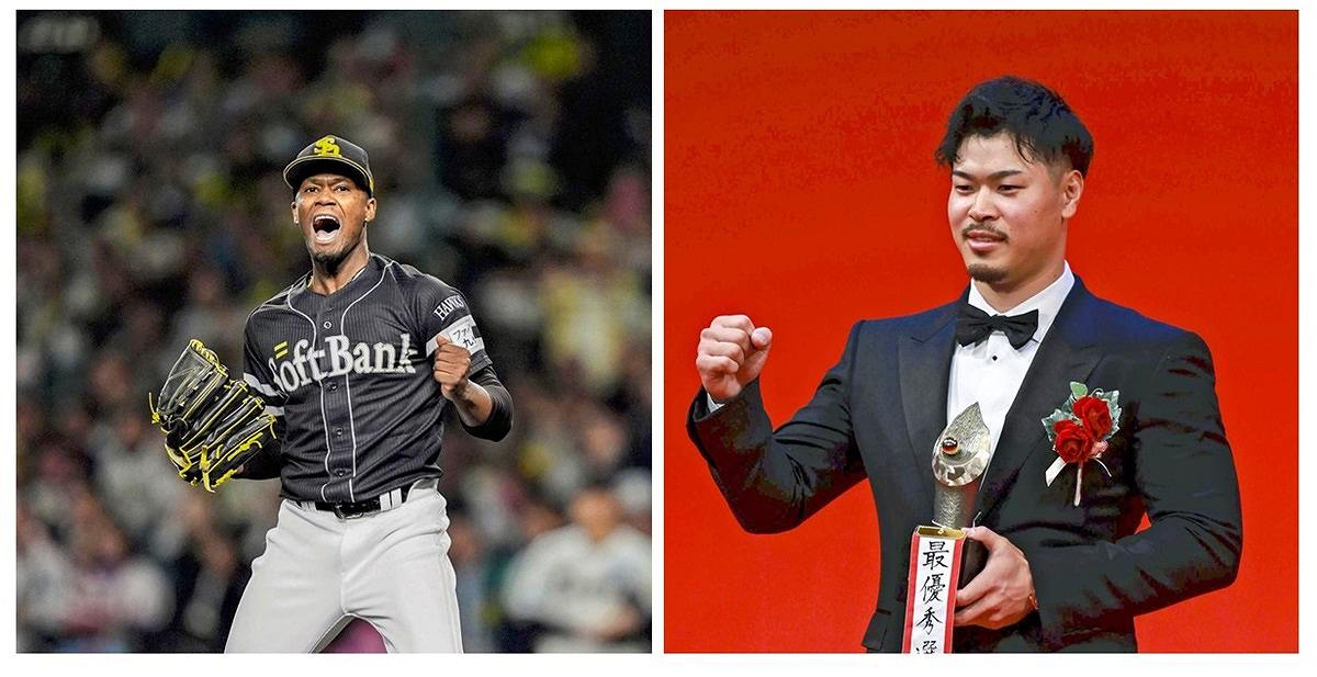 Left: Hawks left-hander Livan Moinelo helped lead the team to the Japan Series title in his second season as a starter. Right: Hanshin’s Teruaki Sato celebrates winning the CL MVP at the NPB Awards ceremony in Tokyo on Wednesday.