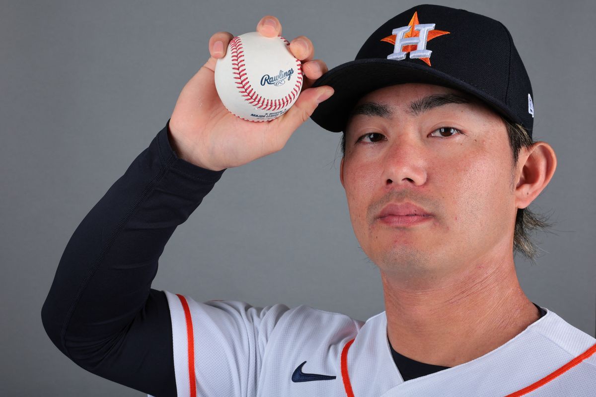 Feb 18, 2026; West Palm Beach, FL, USA; Houston Astros pitcher Tatsuya Imai (45) poses for a photo during media day at CACTI Park of the Palm Beaches.