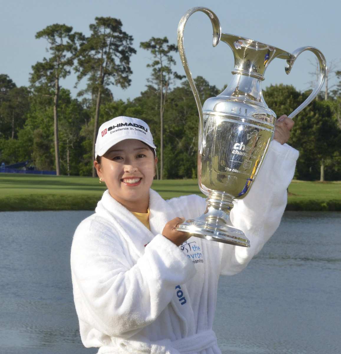 Mao Saigo holds up a trophy after winning the Chevron Championship in The Woodlands, Texas, on Sunday.