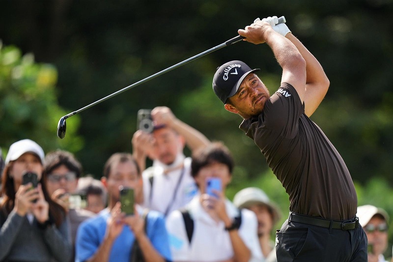 Xander Schauffele, of the U.S., tees off on the second hole during the fourth round of the Baycurrent Classic golf tournament at the Yokohama Country Club in Yokohama, Sunday.