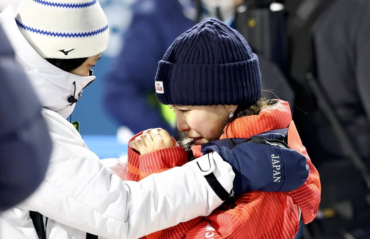 Sara Takanashi is in tears after securing Japan’s medal in Predazzo, Italy, on Tuesday.