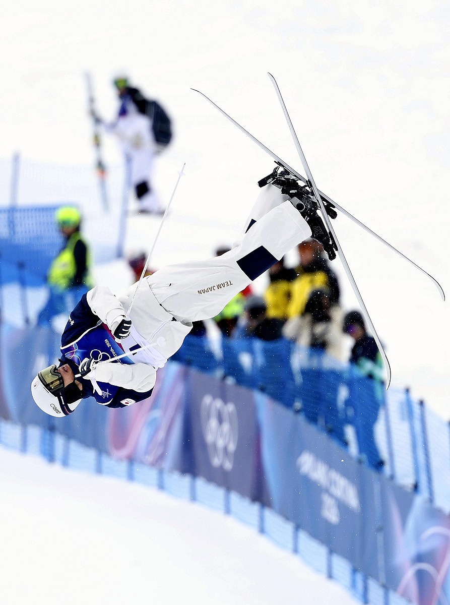 Ikuma Horishima performs an aerial trick during his bronze-medal run in the freestyle skiing men’s moguls on Thursday.