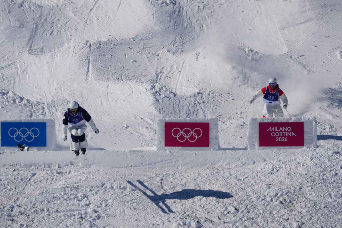 Japan’s Ikuma Horishima, left, misses the last jump against Canada’s Mikael Kingsbury during the men’s freestyle skiing dual moguls finals at the Winter Olympics in Livigno, Italy, on Sunday.