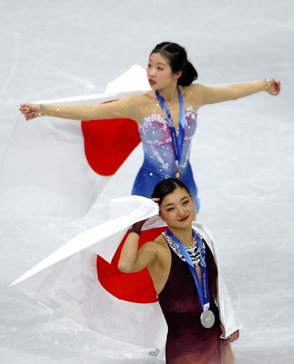 Silver medalist Kaori Sakamoto of Japan and Bronze medalist Ami Nakai of Japan celebrate with the national flag at Milano Ice Skating Arena in Milan, Italy, on Thursday.