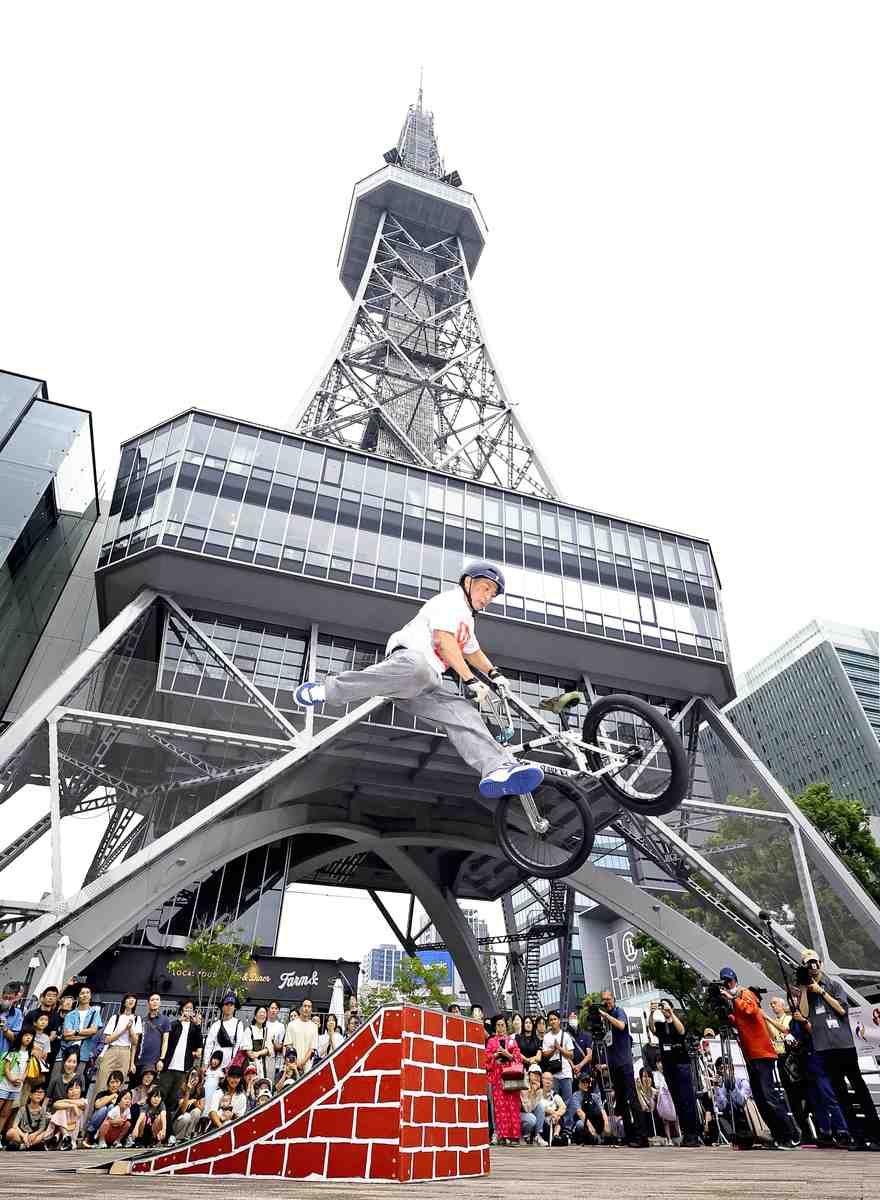 BMX rider Toshio Takagi performed a demonstration during the event, which was held on a special stage set up in front of the Nagoya TV Tower (Chubu Electric Power Co.’s Mirai Tower).