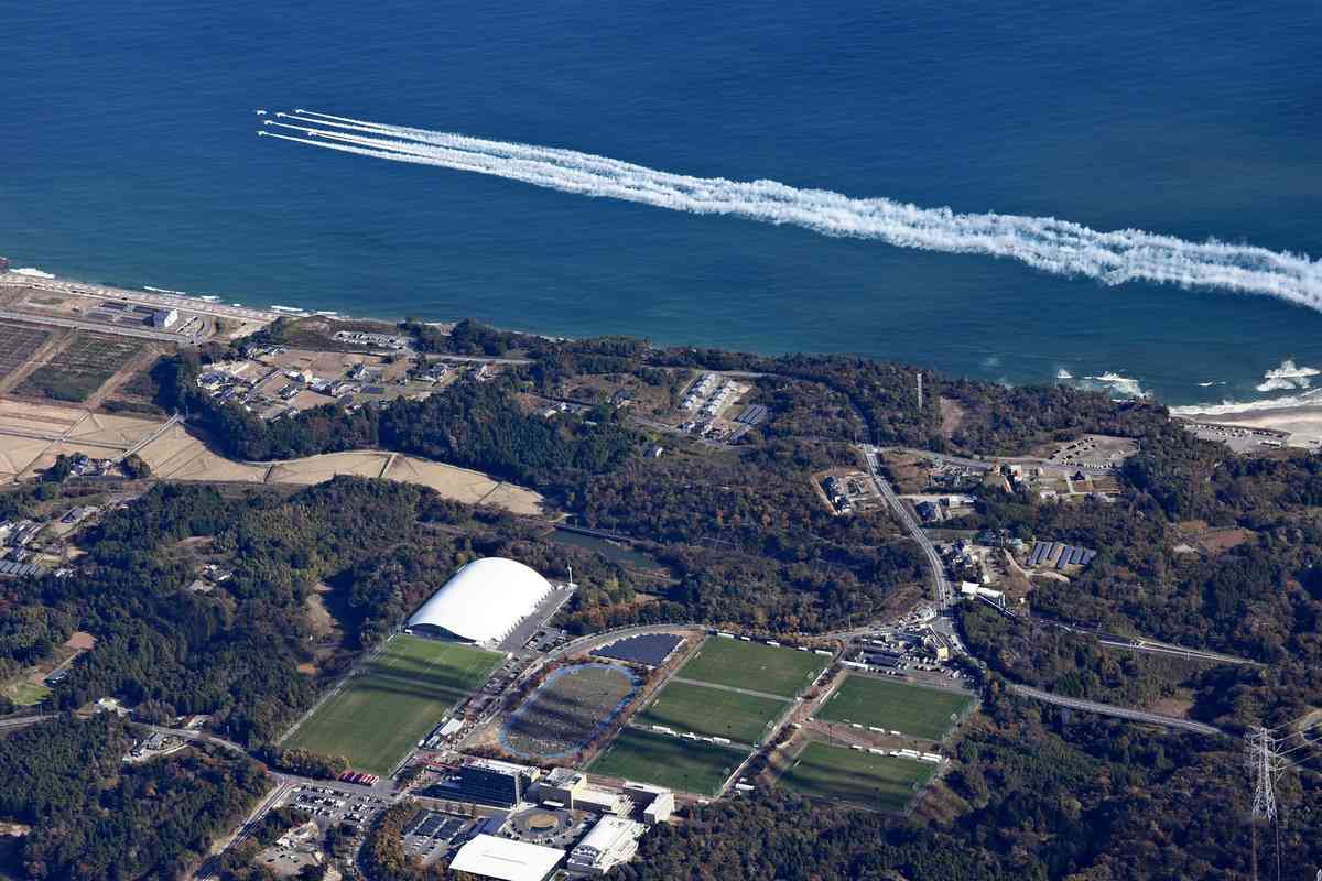 Blue Impulse jets fly over J-Village in Fukushima Prefecture on Saturday.