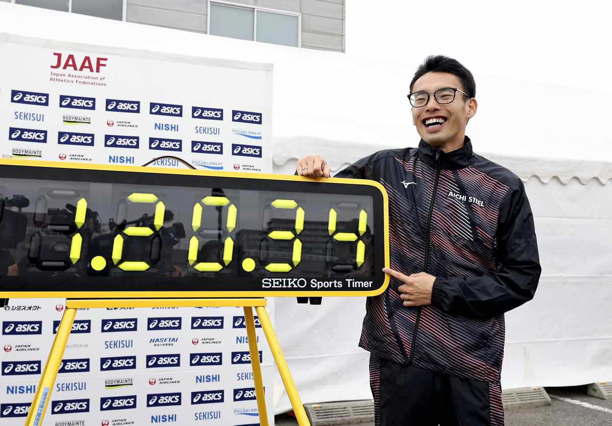 Toshikazu Yamanishi smiles after setting a men’s half marathon race walk world record in Kobe on Sunday