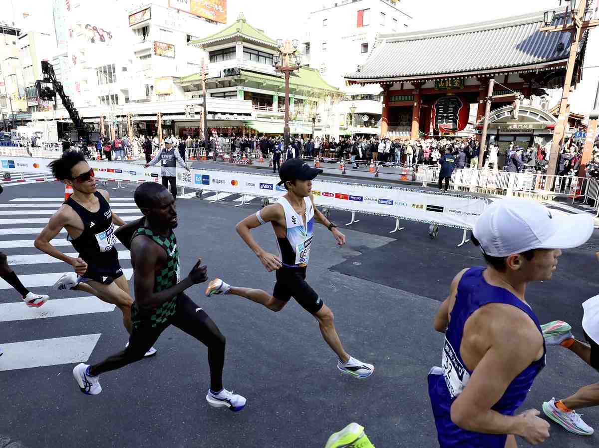 Suguru Osako, center, runs near Kaminarimon gate in the Asakusa district during the Tokyo Marathon on Sunday.
