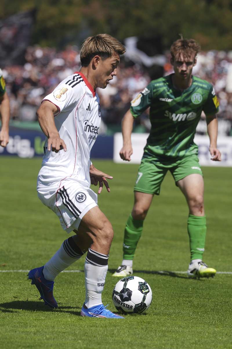 Eintracht Frankfurt’s Ritsu Doan scores a goal during the first round of a German Cup soccer game against FV Engers at Oberwerth stadium, Sunday, Aug. 17, 2025, in Koblenz.