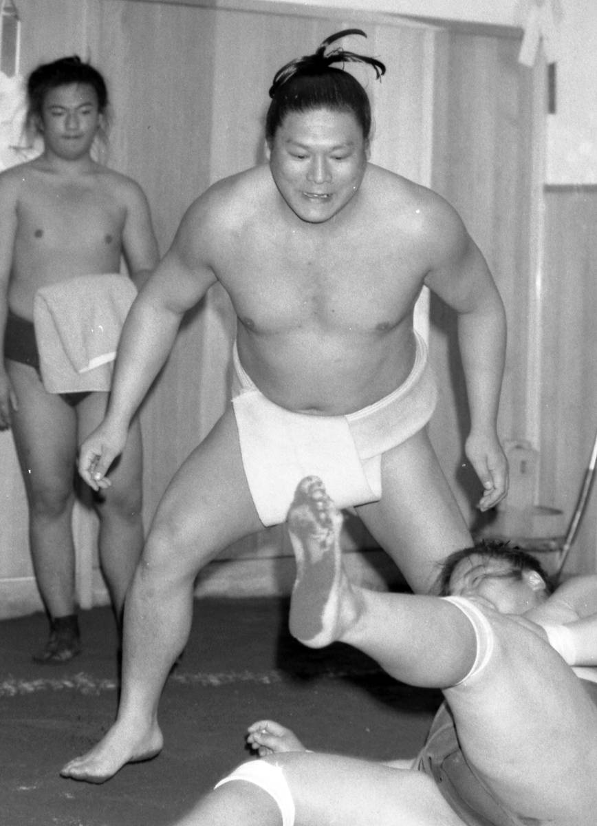 Masuiyama practices in April 1980 when he was an ozeki-rank wrestler.