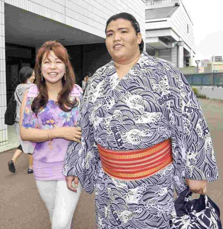 Margarita Omichi, left, walks beside her son Mitakeumi when he was in the third-tier makushita division in May 2015.