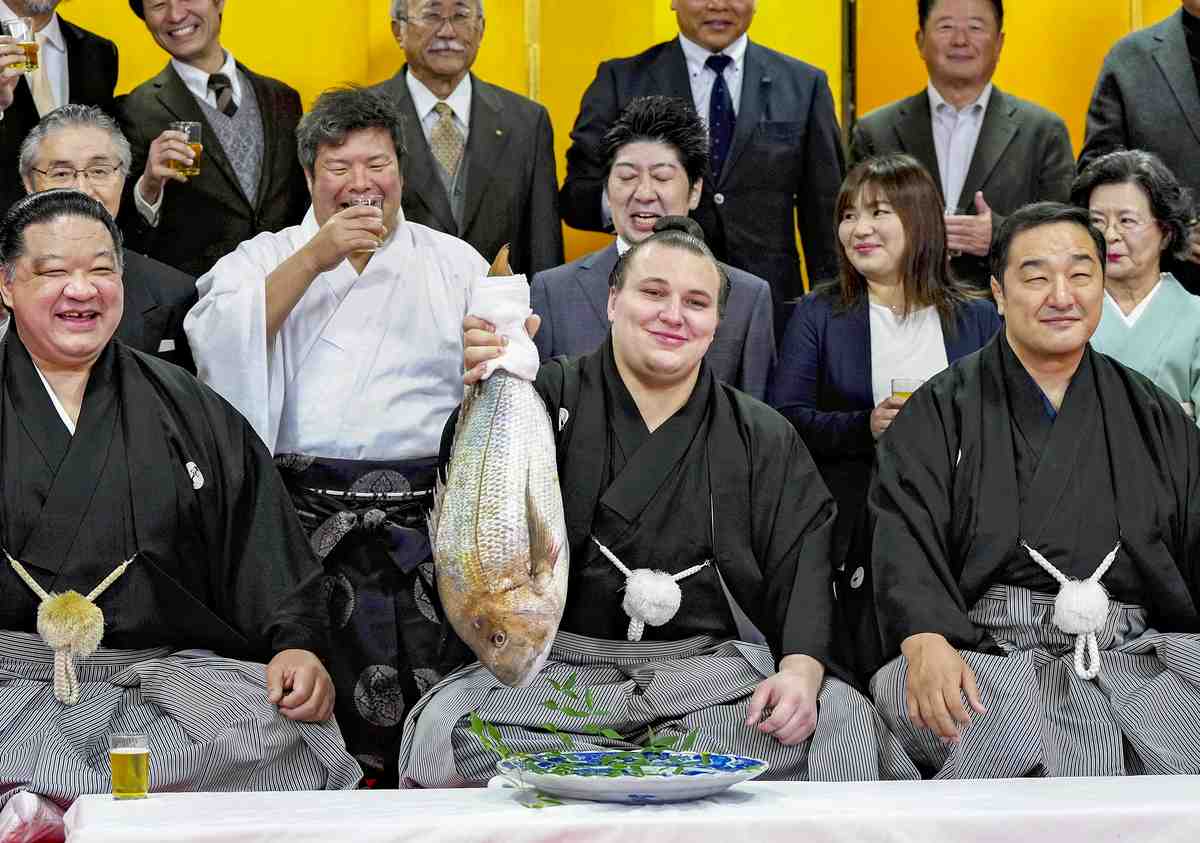 Aonishiki, center, raises a sea bream to celebrate his promotion to ozeki beside his stablemaster Ajigawa, right, in Kurume, Fukuoka Prefecture, on Wednesday.