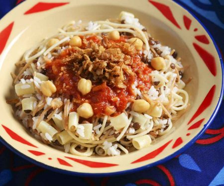 A mixture of rice, legumes such as lentils, spaghetti, macaroni and tomato sauce, Egyptian koshar...
