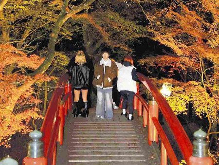 MAEBASHI — The autumn leaves are lit up near Kajika Bridge in Ikaho Onsen hot spring resort in Sh...
