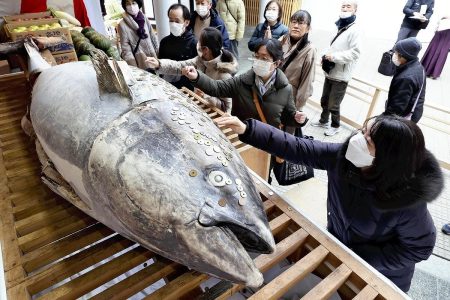 General News3-meter Tuna Offered at Nishinomiya’s Ebisu Shrine, God of Business Prosperity’s Head Shrine; Visitors Attach Money for ‘Wealth to Stick to You’