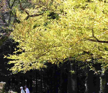 HAKUSAN, Ishikawa — Rows of katsura tree have turned yellow, reaching their peak viewing period, ...