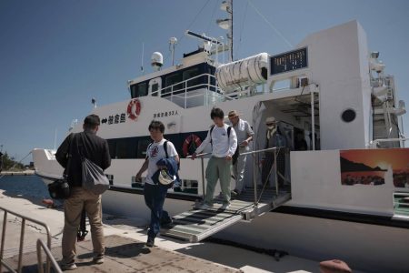 WAJIMA, Ishikawa — About 50 people sailed to Hegurajima Island in the Sea of Japan aboard the pas...
