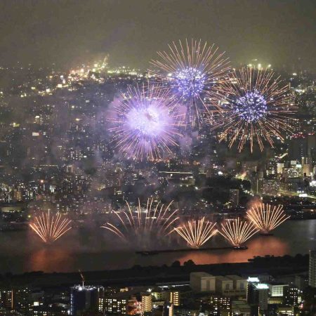 OSAKA — Colorful fireworks lit up the sky in Osaka on Saturday night as the Naniwa Yodogawa Firew...