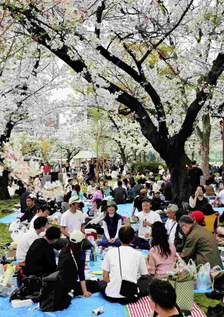 Cherry blossom viewers enjoyed picnics under trees in full bloom at Minami-Tenma Park, in Osaka, ...