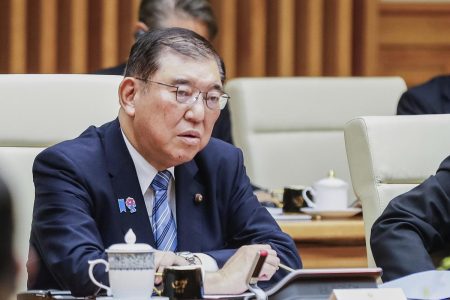 NEW YORK — Prime Minister Shigeru Ishiba, while visiting New York, had a brief chat with U.S. Pre...