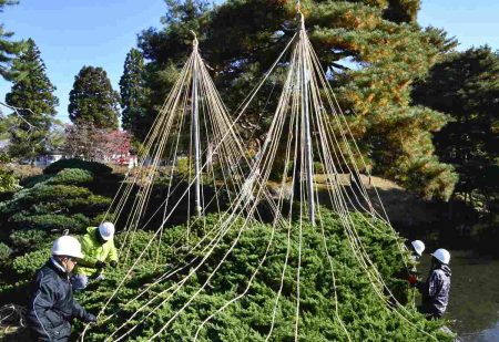 AIZUWAKAMATSU, Fukushima — Preparations for the snow season began on Monday at Oyakuen garden in ...