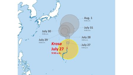 Typhoon Krosa was moving toward north near Tokyo’s Ogasawara Islands as of Sunday morning, accord...