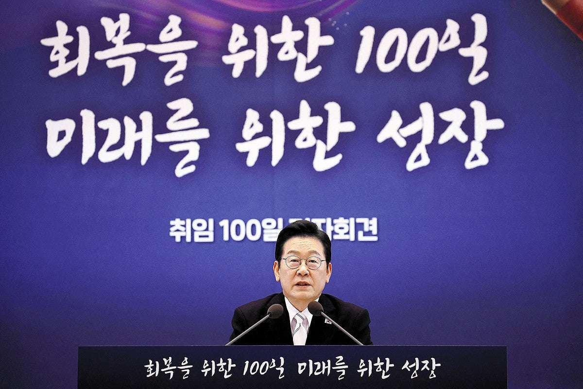 South Korean President Lee Jae Myung speaks at a press conference to mark the first 100 days of his presidency on Thursday.