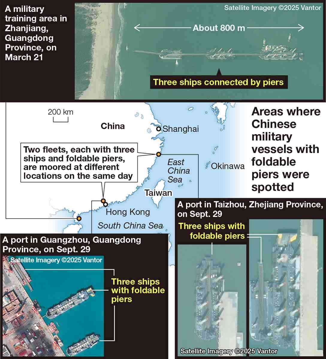 The satellite images obtained by the Yomiuri show fleets with foldable piers moored at a port in Taizhou, Zhejiang Province, which faces the East China Sea, and at another port in Guangzhou, Guangdong Province, in southern China on Sept. 29. The two ports are about 1,100 kilometers apart. It was not previously known that the Chinese military had multiple such fleets.