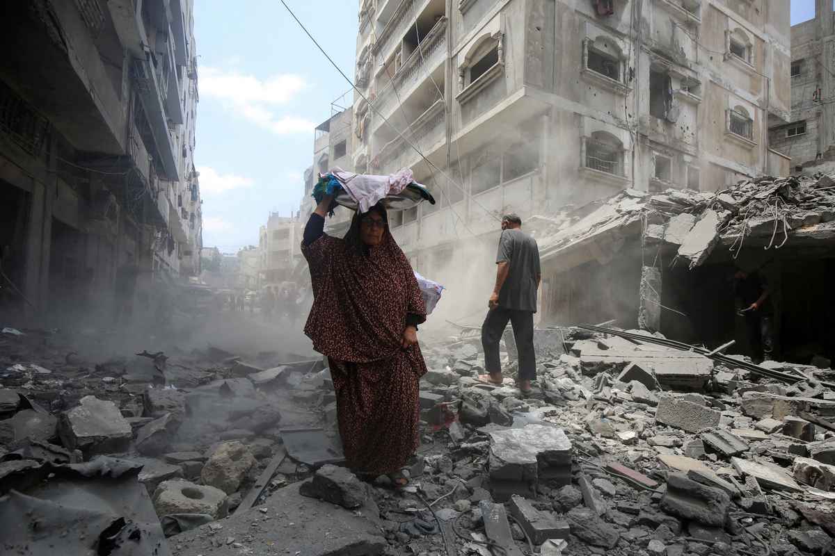 Palestinians inspect the site of a morning Israeli strike on a house, in Gaza City, August 8, 2025.